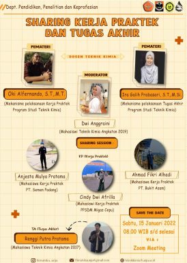 Himpunan Mahasiswa Teknik Kimia (HIMATEKA) Universitas Jambi, melaksanakan acara sharing KP (Kerja Praktek) dan TA (Tugas Akhir) pada tanggal 15 Januari 2022. Acara sharing ini di ikuti oleh mahasiswa Teknik Kimia Universitas Jambi. Acara ini berlangsung dengan baik dan lancar, yang dilaksanakan secara online via zoom meeting. Dalam acara sharing KP dan TA ini terdapat 2 pemateri dari dosen Teknik kimia yaitu Bapak Oki Alfernando S.T.M.T dan Ibu Ira Galih Prabasari S.T.M.Si yang menjelaskan materi tentang mekanisme pelaksanaan KP dan TA, Serta 4 pemateri Sharing Session dari Mahasiswa Teknik Kimia Universitas Jambi yang telah menyelesaikan KP (kerja praktek ) dan TA ( tugas akhir).
